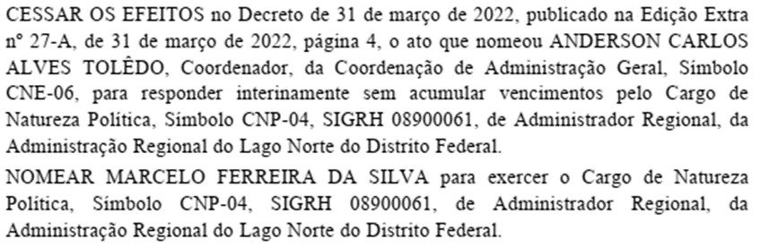 Nomeação consta no DODF desta quarta-feira (7/12). Marcelo Ferreira da Silva, também retorna à Administração Regional do Lago Norte